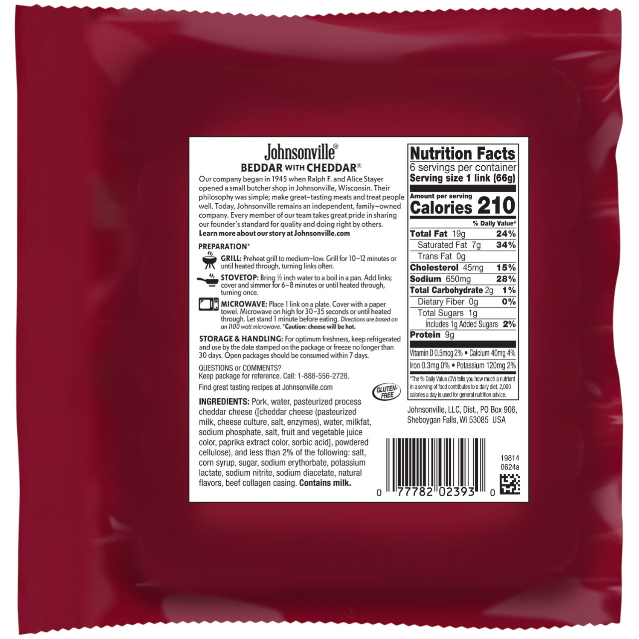 Ingredients: Pork, water, pasteurized process cheddar cheese ([cheddar cheese (pasteurized milk, cheese culture, salt, enzymes), water, milkfat, sodium phosphate, salt, fruit and vegetable juice color, paprika extract color, sorbic acid], powdered cellulose), and less than 2% of the following: salt, corn syrup, potassium lactate, sugar, natural flavors, sodium diacetate, sodium erythorbate, sodium nitrite, beef collagen casing. Contains milk.