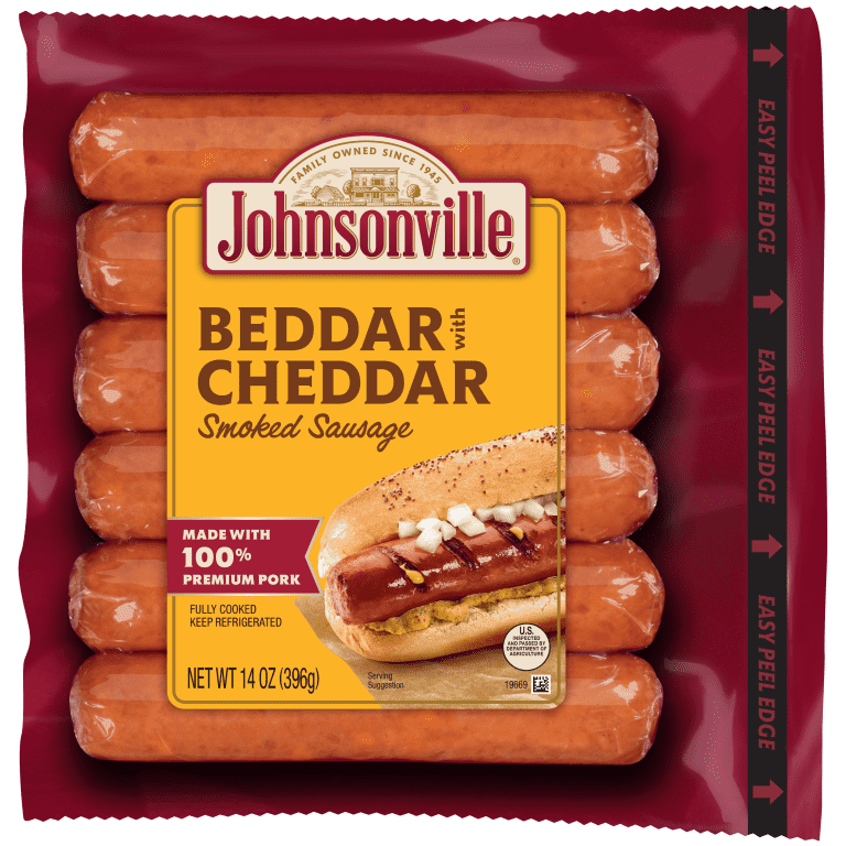 For a deliciously cheesy choice the whole family will love, pick up some Johnsonville Beddar with Cheddar Smoked Sausages for your next cookout or dinner! These tasty smoked sausages are made with 100% premium pork and chunks of real cheddar cheese. These fan favorite Cheddar sausages will have you coming back for seconds!