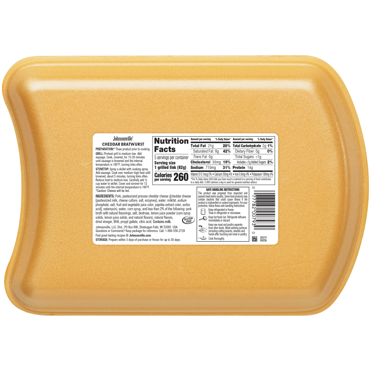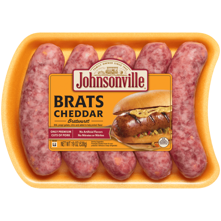 Say Cheese, Brat! Real Wisconsin cheddar cheese gives Johnsonville Cheddar Brats a unique flavor you’ll love. Johnsonville Cheddar Brats are made with only premium cuts of pork and seasoned with a perfect blend of herbs and spices. The flavor combo of bratwurst and cheese are perfect for summer cookouts, Johnsonville Cheddar Brats easy to grill and taste great in a variety of recipes. Cook ’em low and slow!